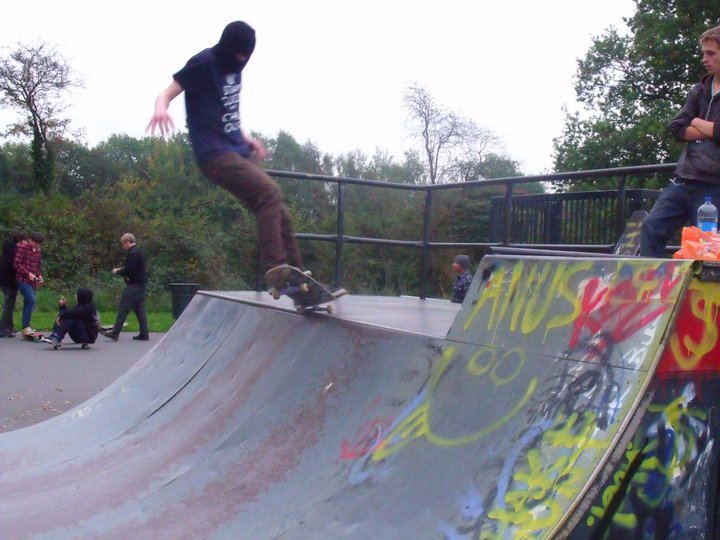 Despite the lack of a top quality showpiece skatepark, and despite being in the middle of warwickshire, where good skateparks and good spots are certainly lacking, Stan is one of the local skaters who’s totally ripping. Not to mention he fully loves transition skating and likes to go all BA:KU with balaclavas, as seen in the photo above. From time to time Stan does skate a bit of street though, and can do the flip tricks that the kids like to see;