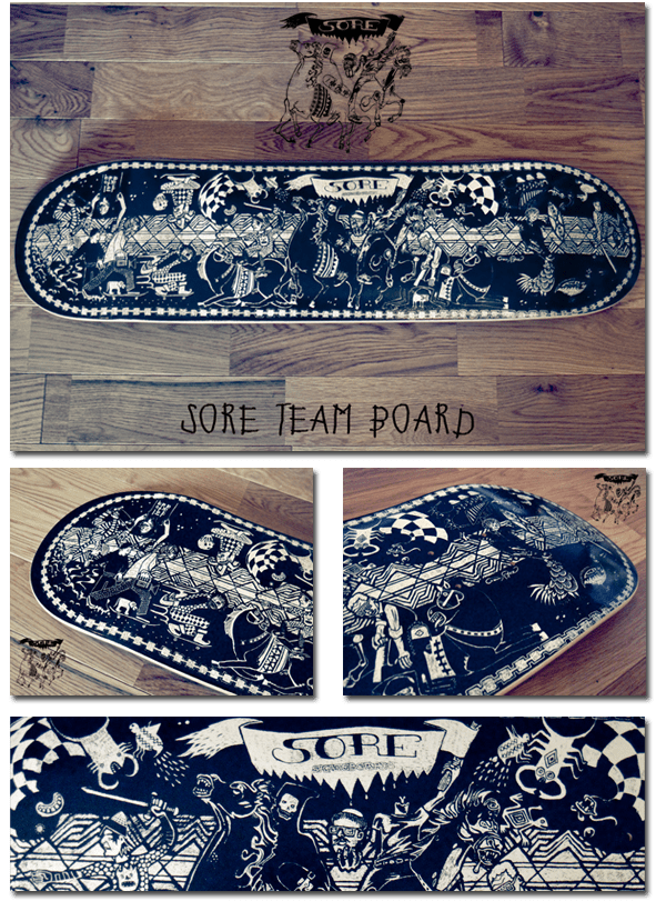 Like what you see? Sore Skateboards are a small company from up north who have been putting out some rad ideas and getting some sick guys on their team (featuring Leicester ripper and part-time boardroom local James “Foz” Foster). What you see above is their first board graphic – pretty nice and a possible wall-hanger if you’re really into your graphics. If you wanna buy one of these, make sure to check out Sore’s shop.