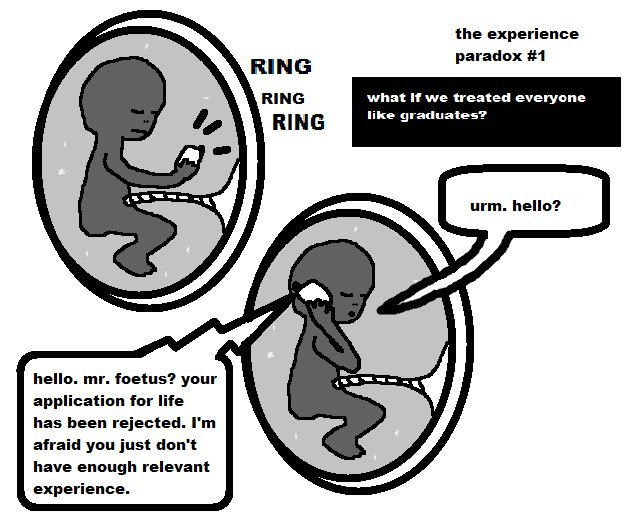 My girlfriend Emily has begun to do a daily comic called “The Experience Paradox”. So far she’s done 3, and they’re all extremely comical, and cast a wry eye at the “graduate” situation. If you simply don’t find this kind of stuff relate-able, then let’s just put it this way; imagine paying almost £10,000 to end up in a situation where it’s incredibly hard to get a job because of over-saturation in specific fields, you’re constantly told you don’t have enough experience to get entry level jobs, and everyone thinks you’ve spent 4 years of your life being a tax-dodging, free-loading drunkard. This, my friends, is what it’s like to be an ex-student (hope you’re looking forward to it, current Coventry and Warwick University students).
