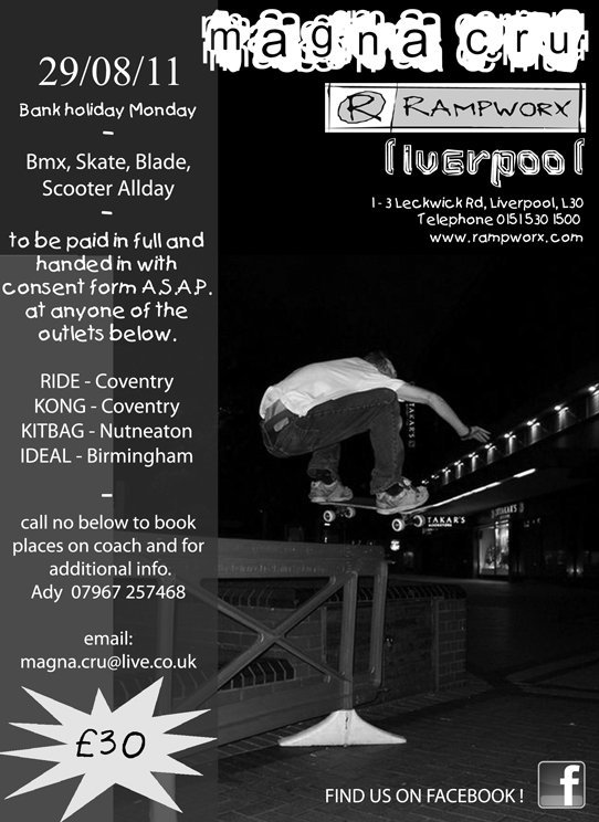 Ladies and gentlemen, I am more than proud to announce that the Magna Cru are back in action!! For those of you who don’t know, the Magna Cru is ran by a dude named Adi – he organises trips to rad parks for a price that is way cheaper than getting the train or driving there yourself. In the past he put together trips to The Works in Leeds, and Rampworx in Liverpool. The Cru’s first trip that Adi’s organising is to Rampworx, on the 29th of August (a bank holiday), and it’s £30 for the day (where, if it’s anything like the last trip I went on, the park will be closed to the public and only our group will be there). If you’re interested, speak to the chaps at Ride, Kong, Kitbag or Ideal, or just message Adi himself at the Magna Cru facebook!