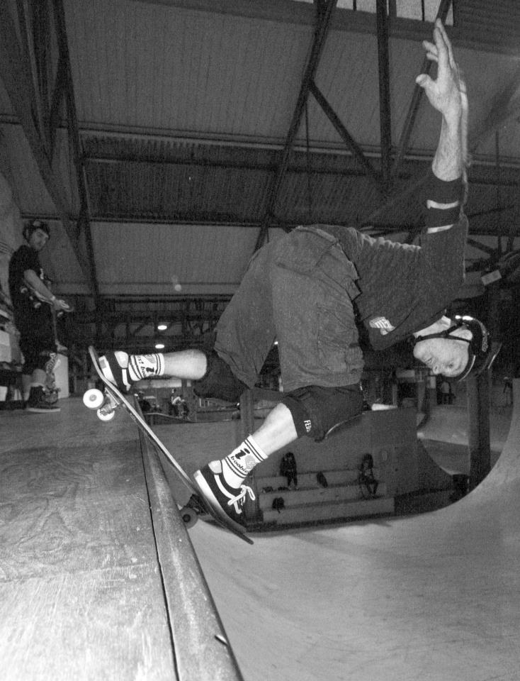 In response to Zippy’s request that we show more vert skating, here’s a pic of Jim t skin on Creation’s vert ramp. Photo by Ben Liddell.