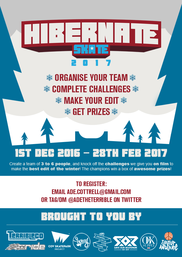 You might notice we have 3 more partners as well – Kenilworth’s own Greg Hulme has got his brand OBK Supply in with us, Shutupandskate are reppin Hibernate, and SOS, the Leamington based charity that got Vicki Park Skatepark built is also partnering up to support the comp.