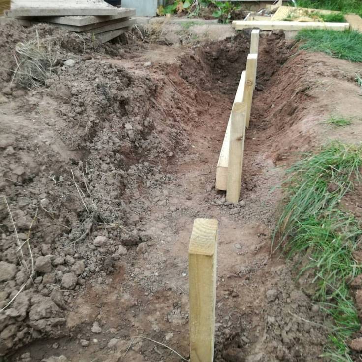 Project TF entry 4 – It’s been slow going building the second retaining wall. Slow, laborious, tough work – dig, saw a fence post, mallet it in, repeat. Added guide timbers for the deck next to the veg patch, and started to prepare the fence end for the deck frame.