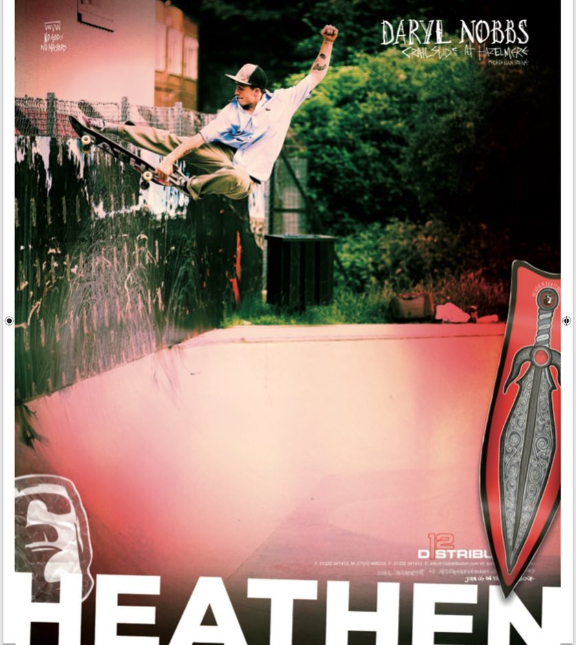 I knew Big Derby Daz Pearcy since I was kinda young, having met him at Derby Storm skatepark, and then bumping into him all over the midlands. There weren’t so many of us riding bowls and being general hesh legends back then – so we were tight! Then, even before he got the job as team manager, he started hassling Michael Wright (who had started Heathen) to give me some boards. This eventually happened in the car park of the UK’s most un-fun skatepark ever: Corby.