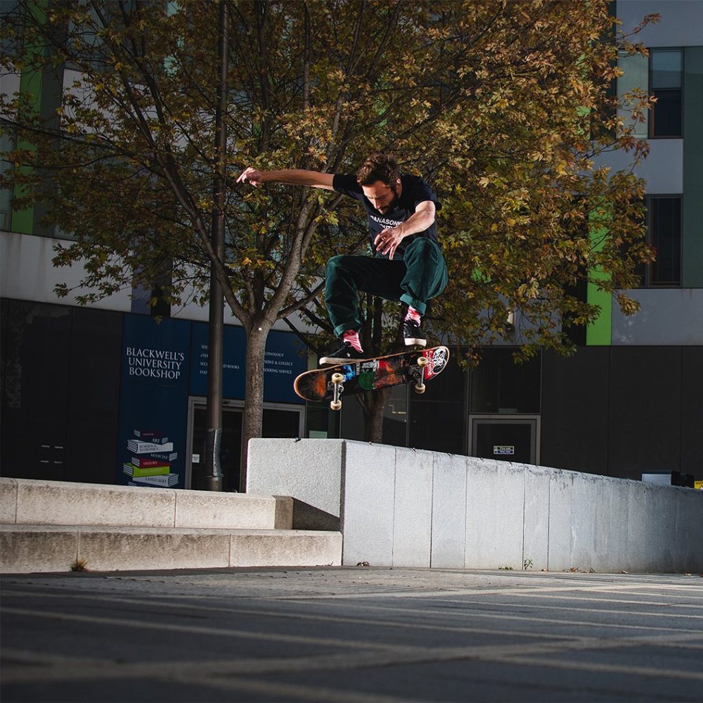 - Favourite spot in Sheffield? It was probably Dreamlands at Sheffield university before it got knocked down, I remember seeing Ash Hall and Dan Beall skating there when I first started skating and it was amazing. Nowadays it’s probably the block spot the council built for us down near castle market, because there’s a beer shop on the spot, haha.