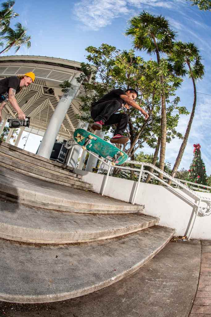 The trippy opening gives way to Joe Milazzo, who charges at spots with full speed, clearing some massive gaps. My favourite tricks here are an Ollie to Front Pivot to Fakie on a bank to power box, and a bonk over a downed tree planter. There’s also some really sick Wallride Grabs down stairs and gaps in this part, and a huge gap to 5-0 on a handrail.