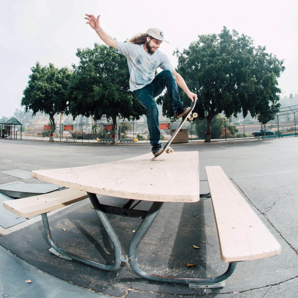 Back to the Mull brothers, with a section from Steve Mull. He opens things with a wild 5050 to hill bomb on the sketchiest, most insecure pole, which we see go horribly wrong a couple of times. Some eyebrow raising surprises in this part, with a No Comply to 5050 on a picnic table, and a 5050 on a massive handrail that’s given up on life, and appears to be half fallen apart.