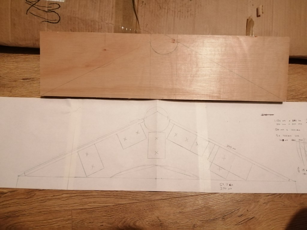 Using these dimensions, I got the profile for the support ends, which need to be triangular with a little hole cut in the top for the coping. I did a whole little blueprint diagram for it to figure out the sizing, and then used this to draw it up on a 2 ft x 0.5 ft piece of 18mm Plywood.