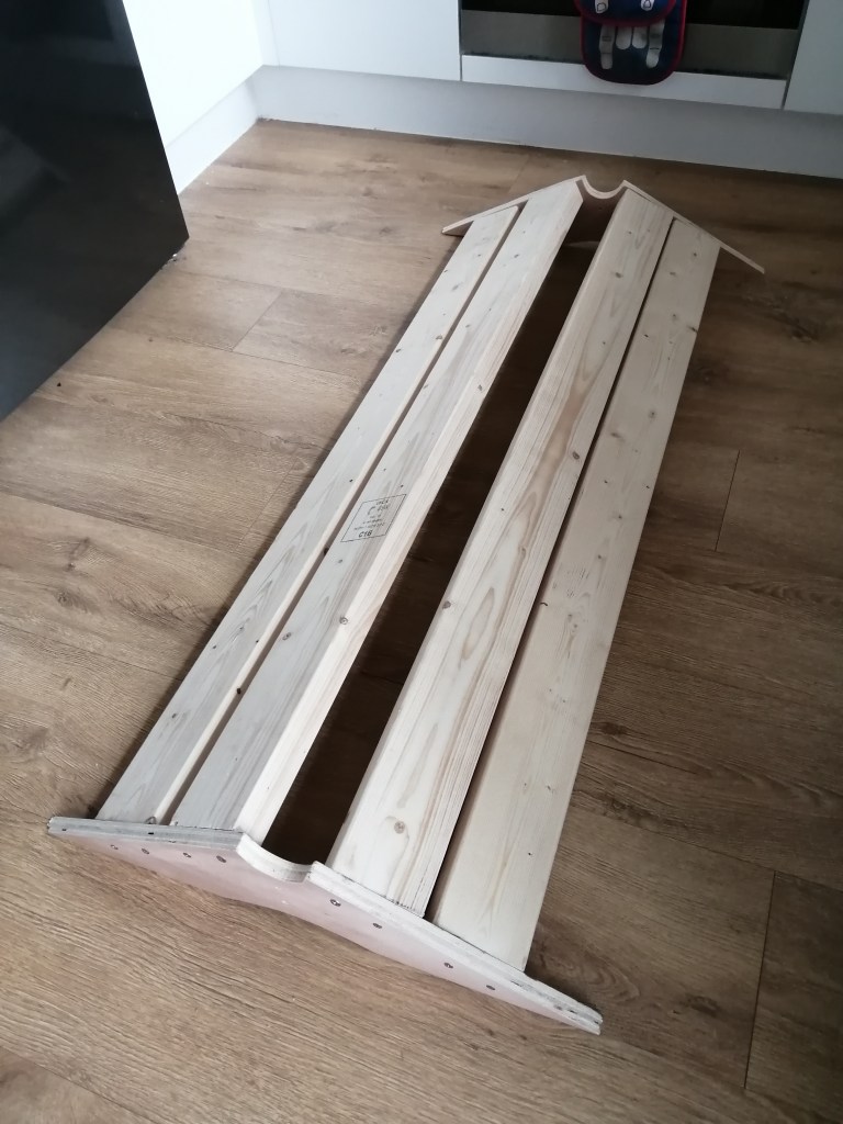 I used some strong decking screws to attach the timbers, and at this point the whole thing goes from “a bunch of bits of wood” to “oh that looks like something I might be able to skate”.