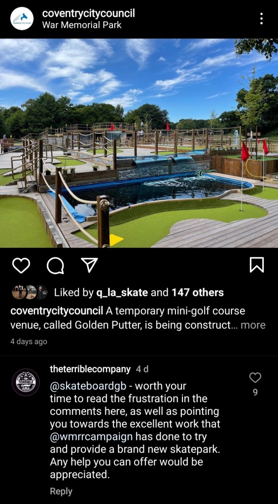 As we hit the Easter Holidays, Coventry City Council, in their infinite wisdom, have announced that a temporary mini golf course will be put up in the War Memorial Park. The Instagram post for this, however, did not get the positive reaction they perhaps hoped for.